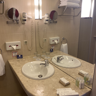 The hotel room itself was simple but airy and elegant. It is good sized and the color scheme was inviting and cozy. I loved the carpets especially, which like the carpets in the floor hallway, were fresh and newly renovated. There is also a nice big window which offers panoramic views of the city. I had an excellent view of the Krasnodar Circus which looks like a brutalist spaceship.